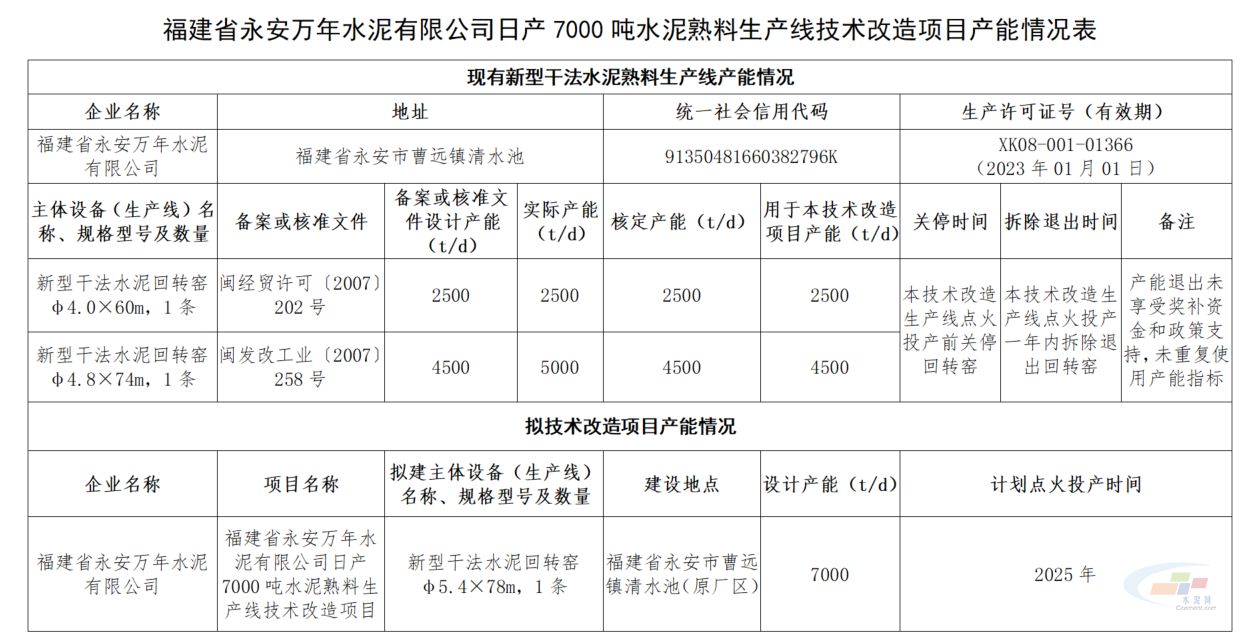 公示顯示,福建省永安萬年水泥有限公司擬拆除整合公司現(xiàn)有的1條日產(chǎn)2500噸和1條日產(chǎn)4500噸水泥熟料生產(chǎn)線,在原廠區(qū)技術改造建設1條日產(chǎn)7000噸水泥熟料生產(chǎn)線。生產(chǎn)線計劃點火投產(chǎn)時間為2025年。